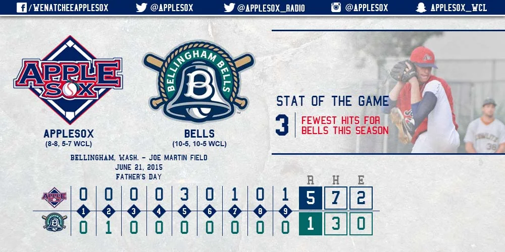 BELLINGHAM, Wash. – The Wenatchee AppleSox (8-8, 5-7) won their first day game of 2015, by a score of 5-1, after falling behind early to the Bellingham Bells (10-5, 10-5), to avoid the series sweep at Joe Martin Field.