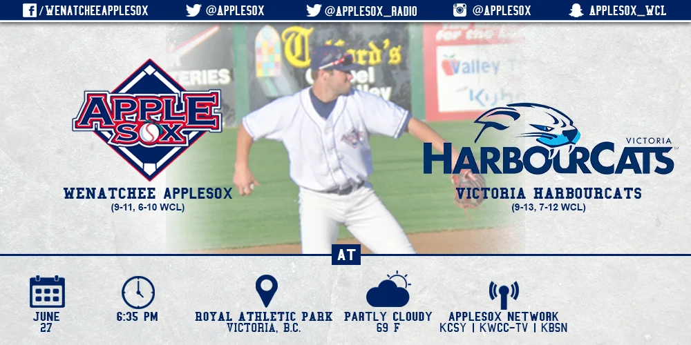 The Wenatchee AppleSox (9-11, 6-10), fourth place in the WCL East, continue their longest road trip of the season, with the Victoria HarbourCats (9-13, 7-12), after last night’s roller coaster slug fest...the AppleSox are playing their 16th franchise season (11th in the WCL) and are led by first-year skipper, AJ Proszek (9-11) (.450), who is in his 3rd season with the Sox, after managing the pitching staff in 2013 and 2014...Proszek is assisted by Miles Kizer and Cory LeBrun, both in their first seasons.
