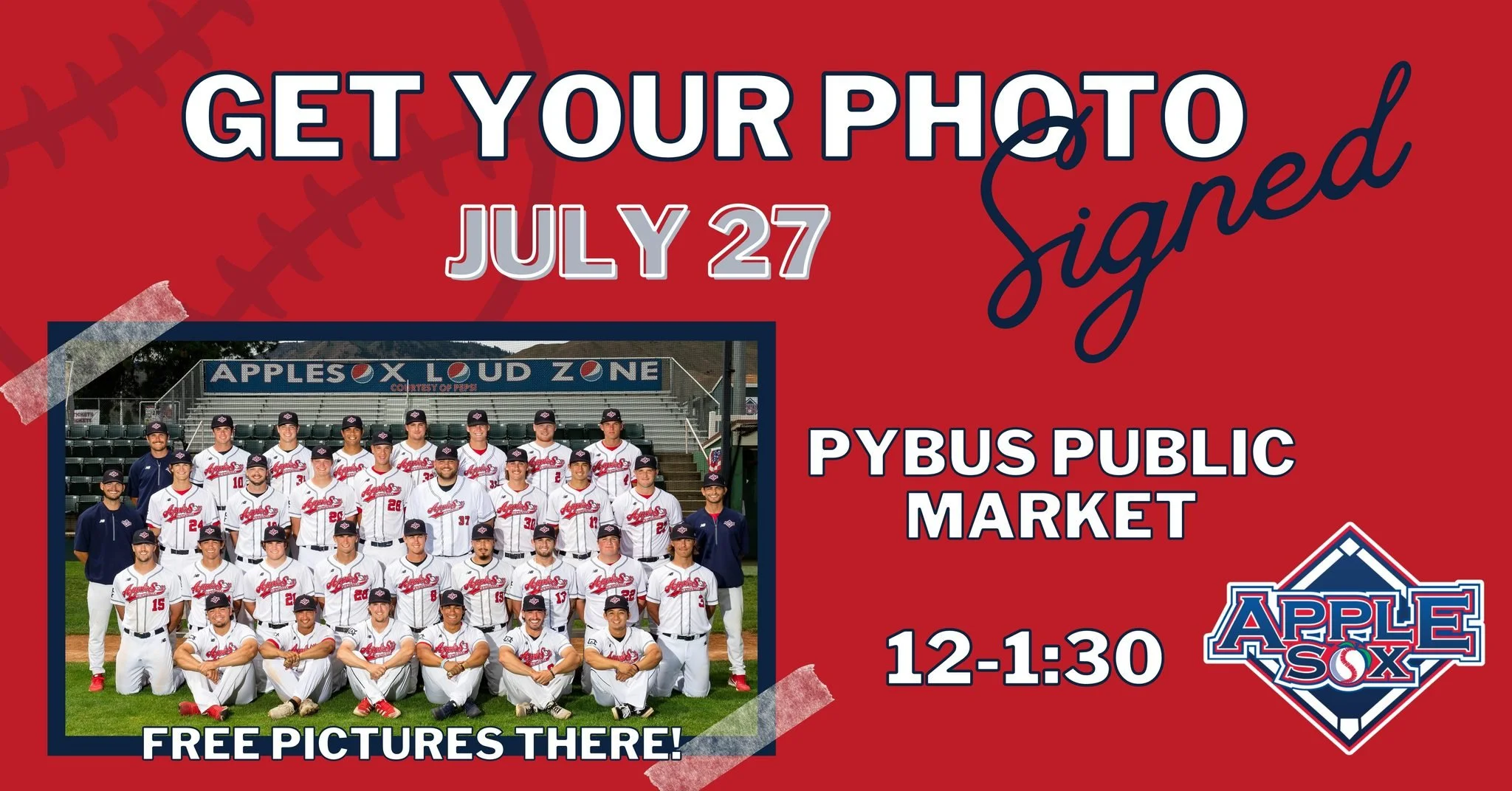 Fans can stop by Pybus from noon until 1:30 p.m. to meet the AppleSox and pick up their own signed team photo for free. The AppleSox team photo autograph party is made possible thanks to our friends at Weinstein Beverage, Sunny FM, Parsons Photography and Pybus Public Market.