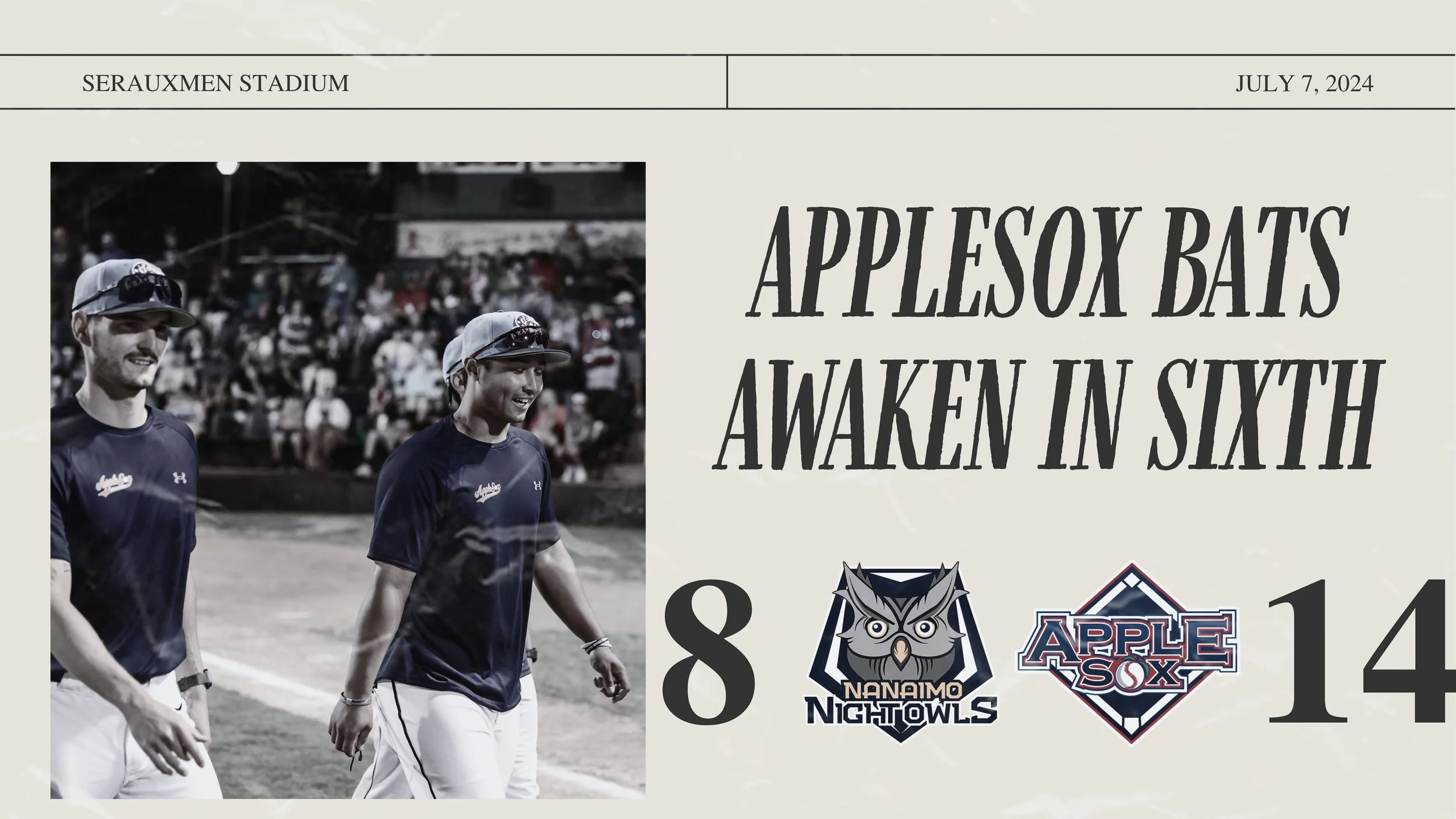/The Wenatchee AppleSox scored 11 runs in the top of the sixth inning and defeated the Nanaimo’s NightOwls, 14-8, on Sunday afternoon at Serauxmen Stadium.